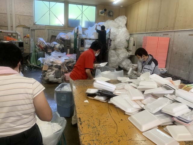 就労継続支援B型リプラスでは、ペットボトルキャップ回収や使用済み発泡スチロール製容器等のリサイクル事業を通じて福祉事業とカーボンニュートラルやCO2削減などの環境保全事業の融合を図り社会的な貢献を担うという大きな目標に取り組んでいます。障害のある仲間たちが発泡を分別し、シールや異物等を除去し、純度の高いプラスチック成型原料である樹脂ペレット(汎用ポリスチレン)を生産する「同愛会リプラス方式」を確立し生産活動を行っています。「同愛会リプラス方式」は、知的障害のある仲間たちが生産活動を通して企業とつながり、社会参加する活動です。またリサイクル事業を通じて、おうちCO-OPリサイクルセンターや各種企業と結びつき障害者の方々の施設外就労を支援しています。